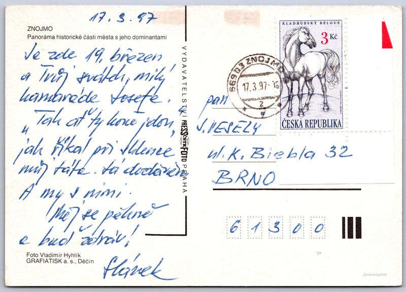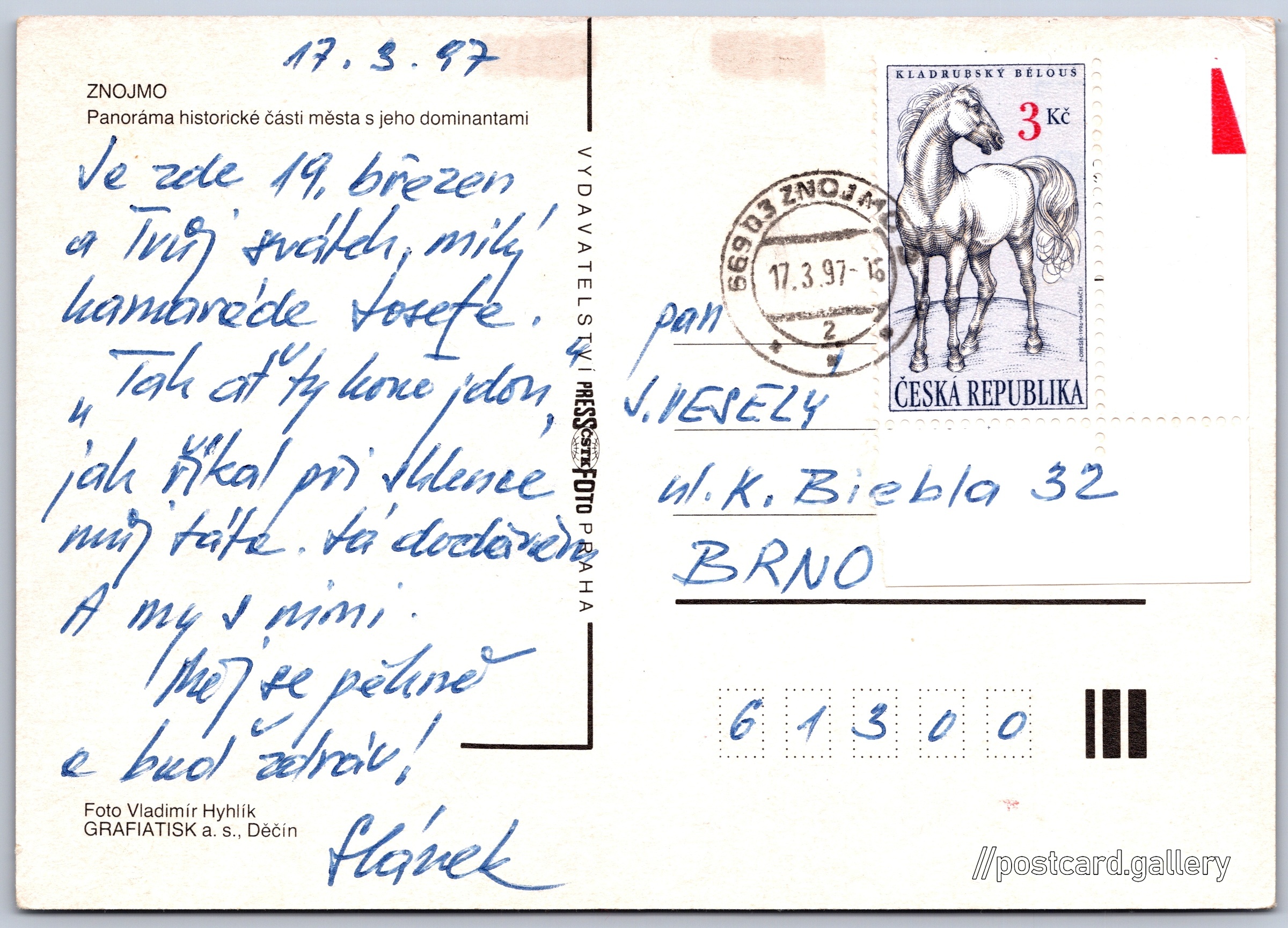 Znojmo Pokud chcete vidět pohlednice ve vyšším rozlišení nebo zobrazovat jejich zadní stranu, tak se prosím nejdříve přihlašte Přihlásit Zaregistrovat ZNOJMOPanoráma historické části města s jeho dominantami Jazyk tištěného textu na pohlednici: čeština Masarykovo náměstí, Znojmo, Znojmo ukázat na mapě V blízkém okolí místa zobrazeného na pohlednici lze najít 5 jiných pohlednic. Zobrazit blízké pohlednice Vydavatel: PressFoto Praha (Československo) Odhadované datum vydání pohlednice: 1994 - 1997 Pomozte nám zpřesnit rok vzniku pohlednice Velikost (š x v) a tvar pohlednice: 148 x 104 mm (5.83" x 4.09"), obdélník Osoby spjaté s touto pohlednicí: Vladimír Hyhlík(Autor fotografie) Prošlá poštou:Datum na razítku: 17.3.1997Datum napsání pohledu: 17.3.1997 Ceny: Vyplacené známky: 3,00 Kč (CZK) DiskuseVložit příspěvek Přidat novou složku ... Spravovat složky ...