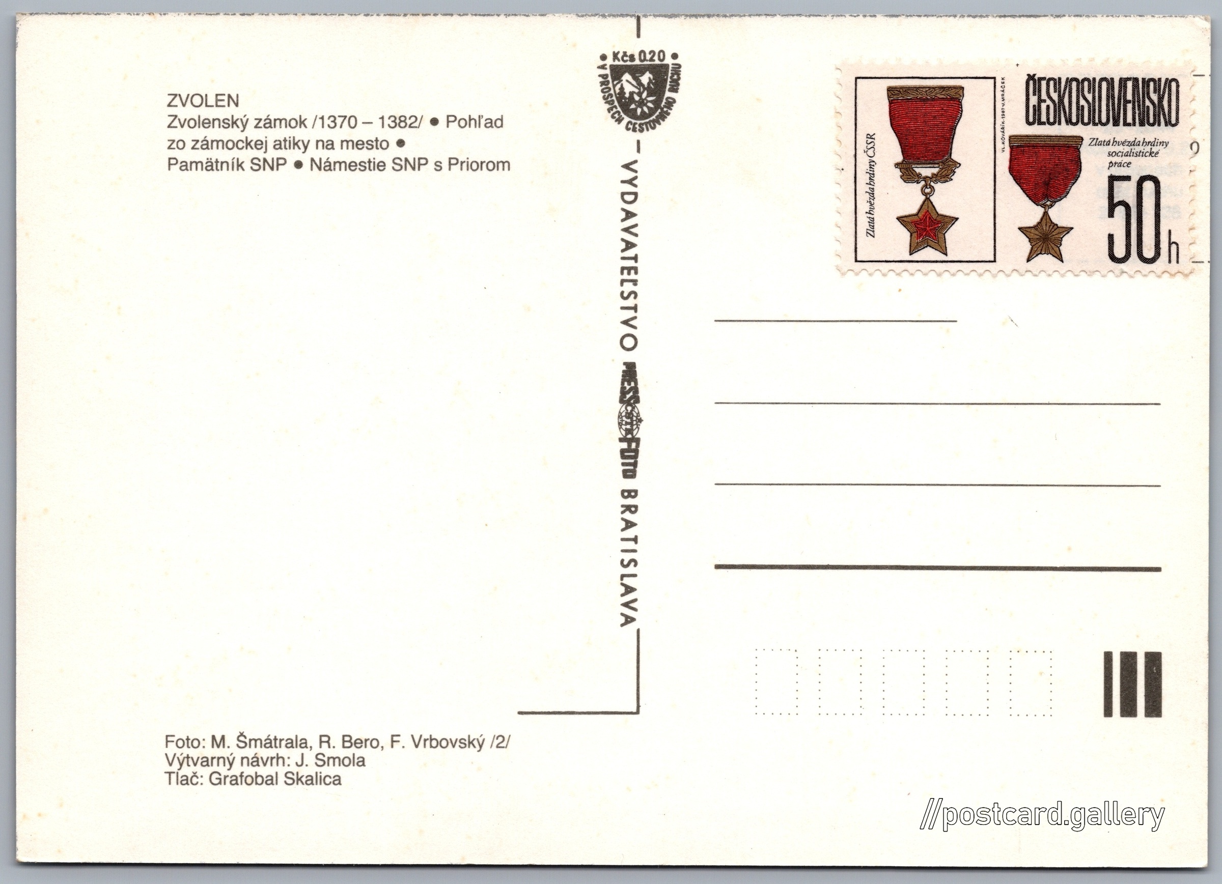 Zvolen Pokud chcete vidět pohlednice ve vyšším rozlišení nebo zobrazovat jejich zadní stranu, tak se prosím nejdříve přihlašte Přihlásit Zaregistrovat Zvolen Zvolen- Zvolenský zámok /1370-1382/- Pohľad zo zámockej atiky na mesto- Pamätník SNP- Námestie SNP s Priorom Jazyk tištěného textu na pohlednici: slovenština Námestie SNP, Zastávka autobusu, Zvolen, Slovensko ukázat na mapě V blízkém okolí místa zobrazeného na pohlednici lze najít 17 jiných pohlednic. Zobrazit blízké pohlednice Vydavatel: PressFoto Bratislava (Československo) Datum vydání není známo Pomozte nám odhadnout datum vzniku pohlednice Velikost (š x v) a tvar pohlednice: 148 x 105 mm (5.83" x 4.13"), obdélník Osoby spjaté s touto pohlednicí: Milan Šmátrala(Autor fotografie) Ing. R. Bero(Autor fotografie) František Vrbovský(Autor fotografie) Čistá pohlednice (neprošlá poštou) Ceny: Příplatek na tur. ruch: 0,20 --- (---)) DiskuseVložit příspěvek Přidat novou složku ... Spravovat složky ...
