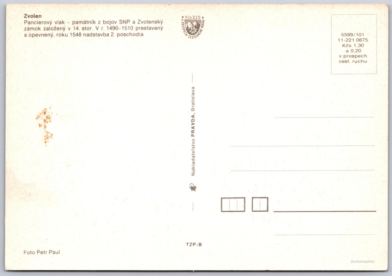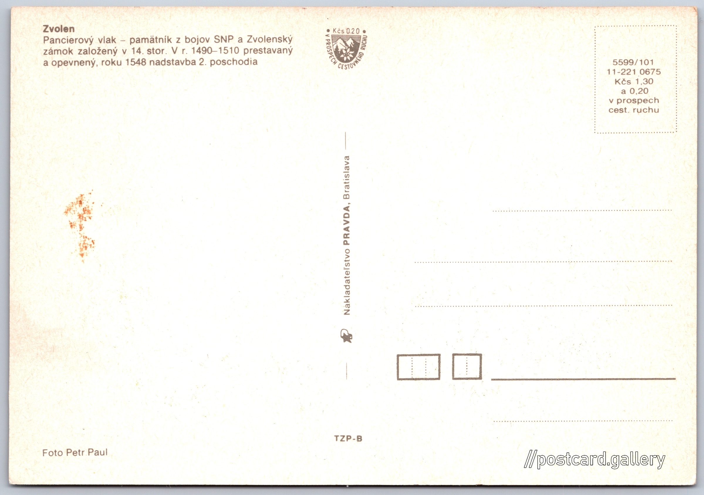 Zvolenský hrad Pokud chcete vidět pohlednice ve vyšším rozlišení nebo zobrazovat jejich zadní stranu, tak se prosím nejdříve přihlašte Přihlásit Zaregistrovat Zvolen ZvolenPancierový vlak - pamätník z bojov SNP a Zvolenský zámok založený v 14. stor. V r. 1490-1510 prestavaný a opevnený, roku 1548 nadstavba 2. poschodia Jazyk tištěného textu na pohlednici: slovenština Zvolenský hrad, Zámek, Námestie SNP 594/1, Zvolen, Slovensko ukázat na mapě V blízkém okolí místa zobrazeného na pohlednici lze najít 11 jiných pohlednic. Zobrazit blízké pohlednice Vydavatel: Nakladateľstvo PRAVDA, Bratislava (Československo) Rok vydání pohlednice: červen, 1975 Velikost (š x v) a tvar pohlednice: 150 x 104 mm (5.91" x 4.09"), obdélník Osoby spjaté s touto pohlednicí: Petr Paul(Autor fotografie) Čistá pohlednice (neprošlá poštou) Ceny: Cena pohlednice: 1,30 Kčs (CSK) (+0,20 Kčs přípl. na tur. ruch) Kódy na pohlednici: 5599/101 11-221 0675 DiskuseVložit příspěvek Přidat novou složku ... Spravovat složky ...