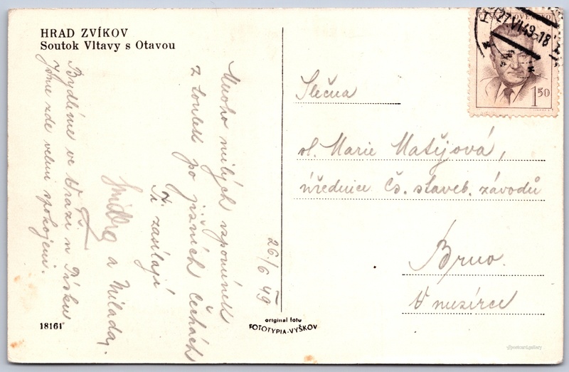 zxczxczx Pokud chcete vidět pohlednice ve vyšším rozlišení nebo zobrazovat jejich zadní stranu, tak se prosím nejdříve přihlašte Přihlásit Zaregistrovat HRAD ZVÍKOVSoutok Vltavy s Otavou Jazyk tištěného textu na pohlednici: čeština Zvíkovské Podhradí 1, 397 01 Zvíkovské Podhradí, Czechia ukázat na mapě V blízkém okolí místa zobrazeného na pohlednici lze najít 15 jiných pohlednic. Zobrazit blízké pohlednice Vydavatel: Fototypia - Vyškov (Československo) Odhadované datum vydání pohlednice: 1946 - 1949 Pomozte nám zpřesnit rok vzniku pohlednice Velikost (š x v) a tvar pohlednice: 139 x 89 mm (5.47" x 3.50"), obdélník Prošlá poštou:Datum na razítku: 27.6.1949Datum napsání pohledu: 26.6.1949 Ceny: Vyplacené známky: 1,50 Kčs (CSK) Kódy na pohlednici: 18161 DiskuseVložit příspěvek Přidat novou složku ... Spravovat složky ...